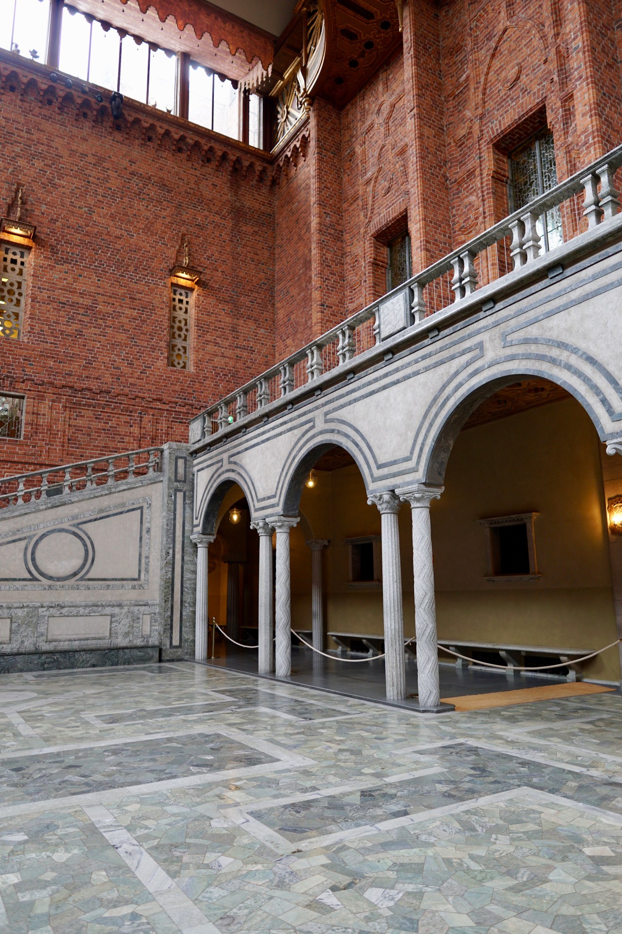 The city hall tour was very interesting, the bland brick exterior providing no clue to the colourful and grand inside. The tour commenced in the Italian piazza inspired courtyard – banquet hall called the Blue room. This is where the Nobel prize awards are held and the general public can rent this hall for weddings and functions and enjoy the outside park like surrounding next to the water. Inside this hall is the largest organ in Scandinavia and the floors are lined in Swedish marble which is a white green blue mix.