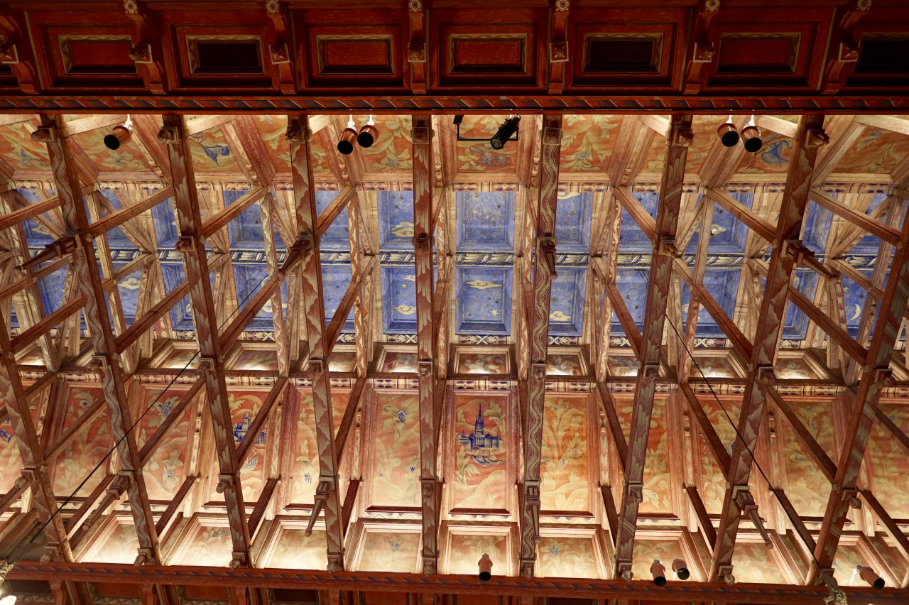 The next room we visiting was the city council chamber which was sumptuous with velvet and a beautifully painted ceiling decorated in typical old Swedish style like a Viking longhouse, or like an upside down ship frame.