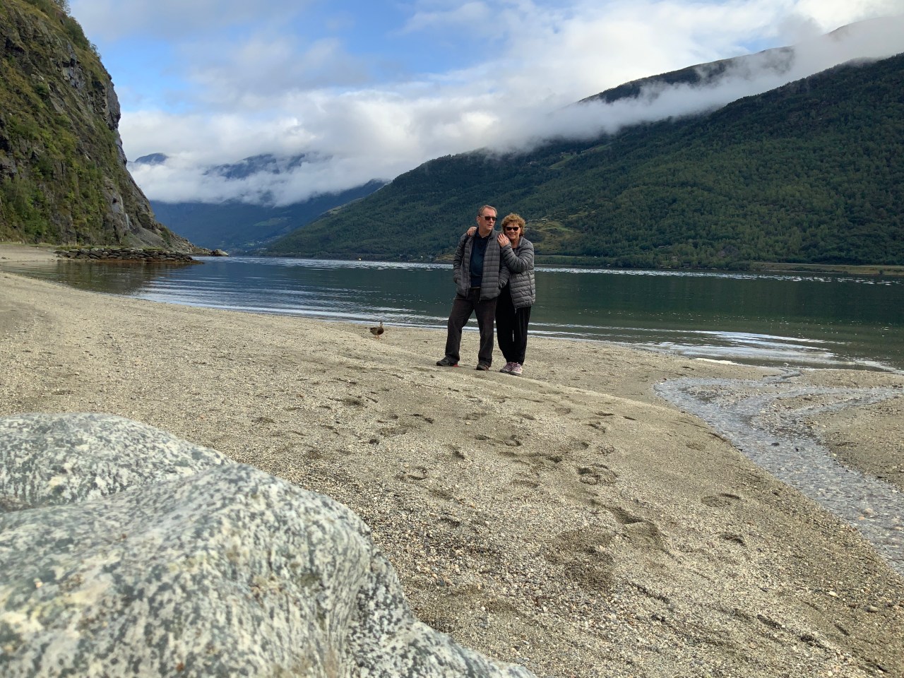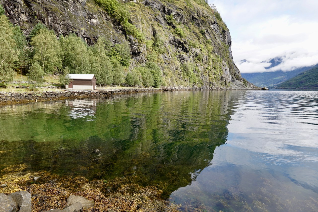 Given the timings, and what we were able to see and experience from land we decided to give a fjord cruise a miss. It would take 4 hours and instead we would look at a few scenic places on the way out from Flam, and go to Vik to see another Stav church. Additionally whilst it is very pretty here, I have the impression that Milford Sound and our Fjords at home are possibly more scenic. What you see here is two high rocky faces with lots of small thin waterfalls running like streams of tears down its side, and dark green water which only has clarity close to shore. There is little to no sea, bird, and animal life which seems odd and makes it very quiet. Having said that check the duck photo bombing the picture.