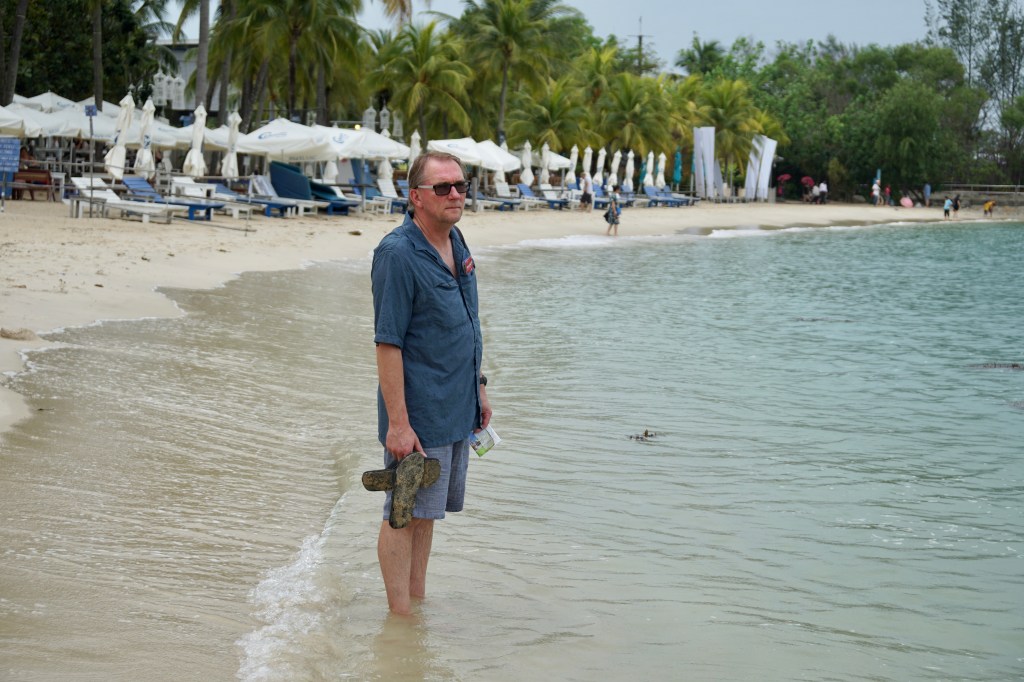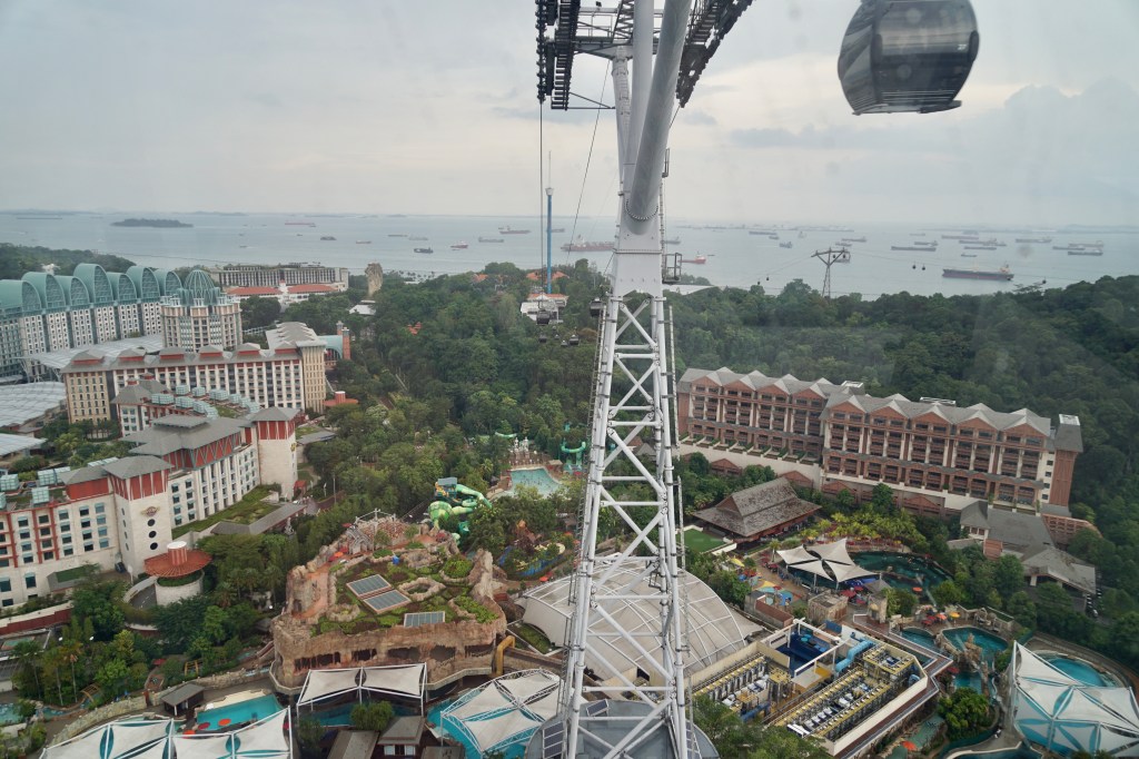 After breakfast we caught the subway train down the city and changed once to go west to the closest station for the gondola to Sentosa Island. The day was typically overcast and drizzly and when it wasn’t raining which gave a nice respite, the humidity was pretty heavy and encouraged our internal precipitation (perspiration). It took a little bit of navigation with iPad help but we eventually found the ticketing place for the Gondola behind a big building, got our tickets and enjoyed the short scenic ride across the bay.