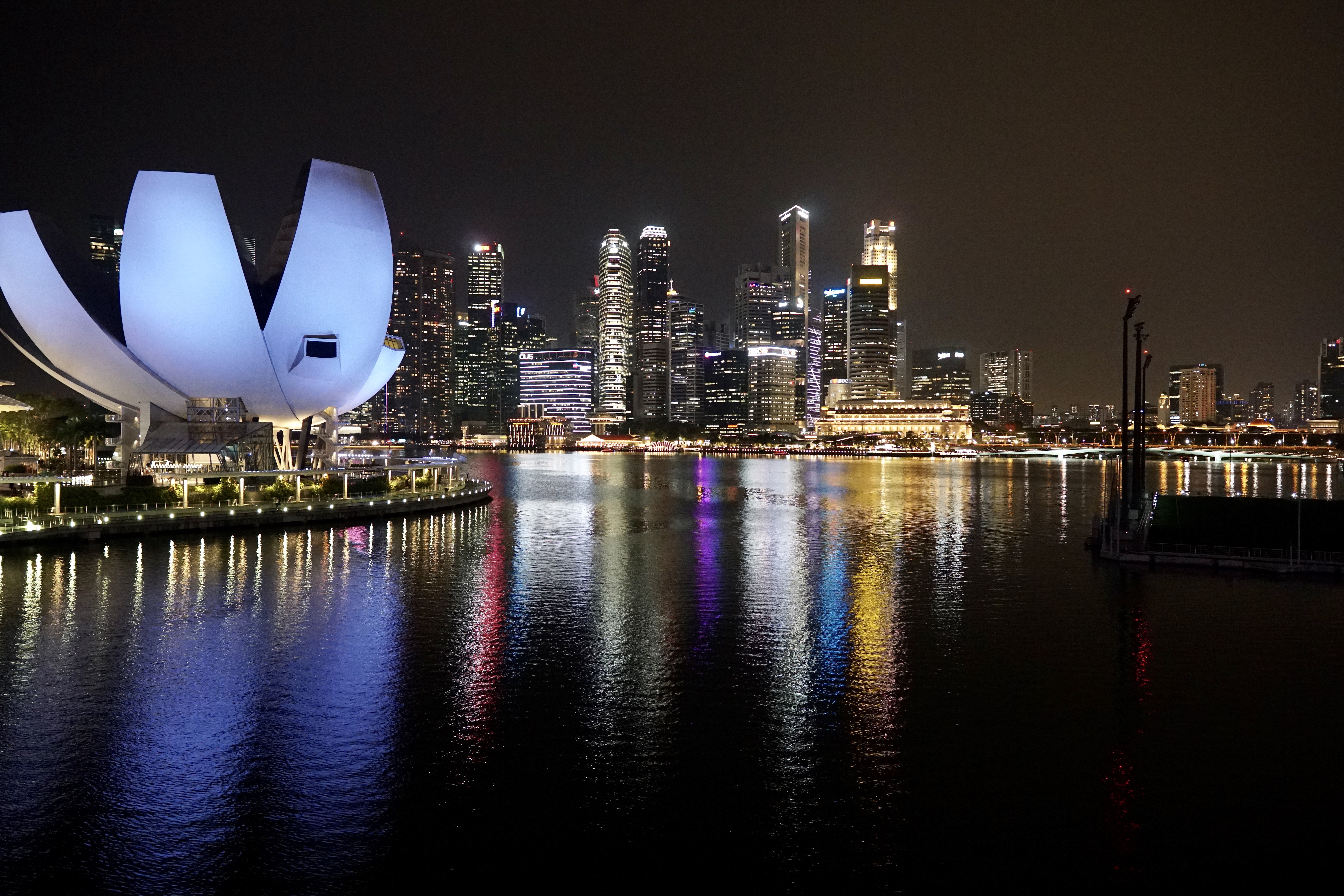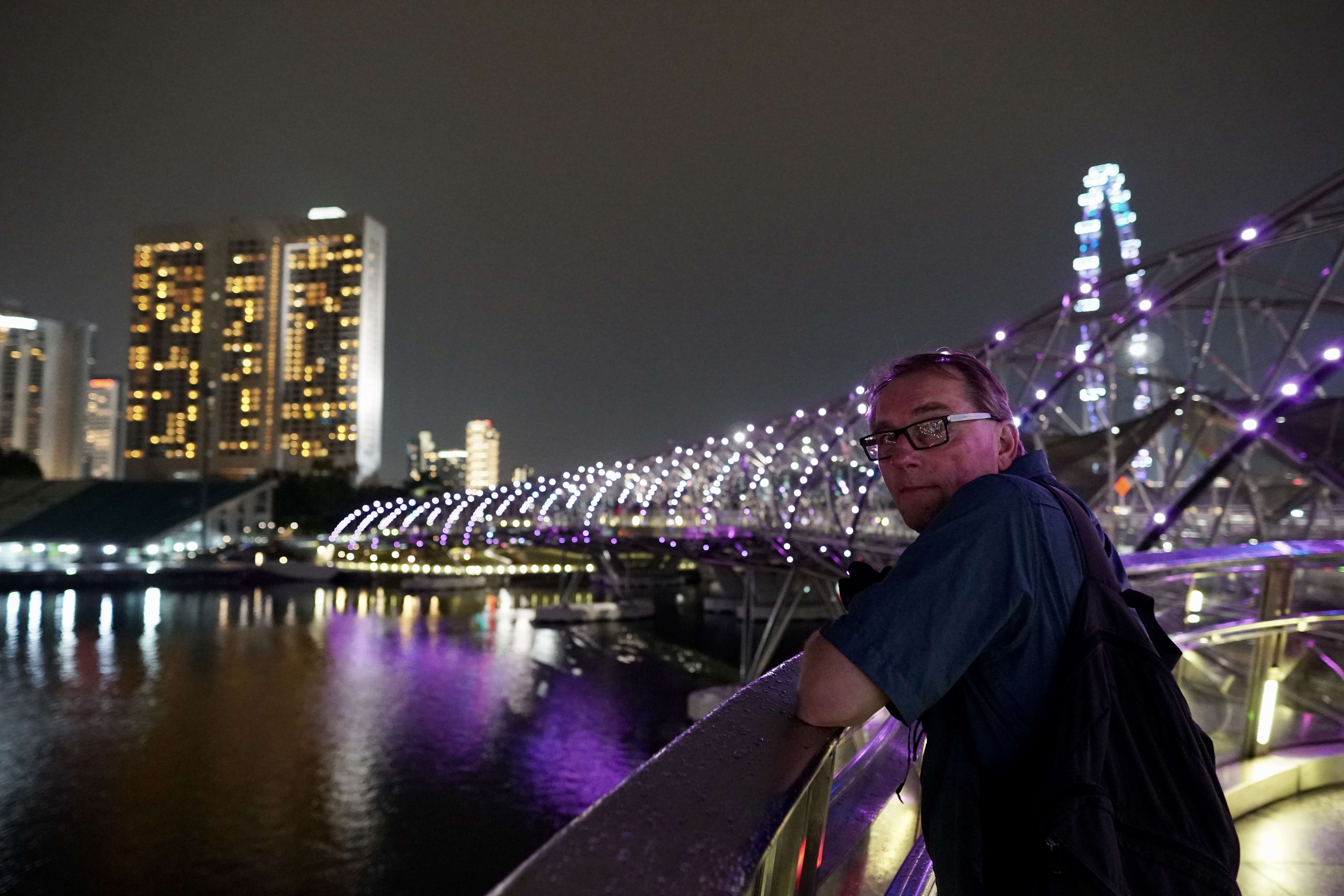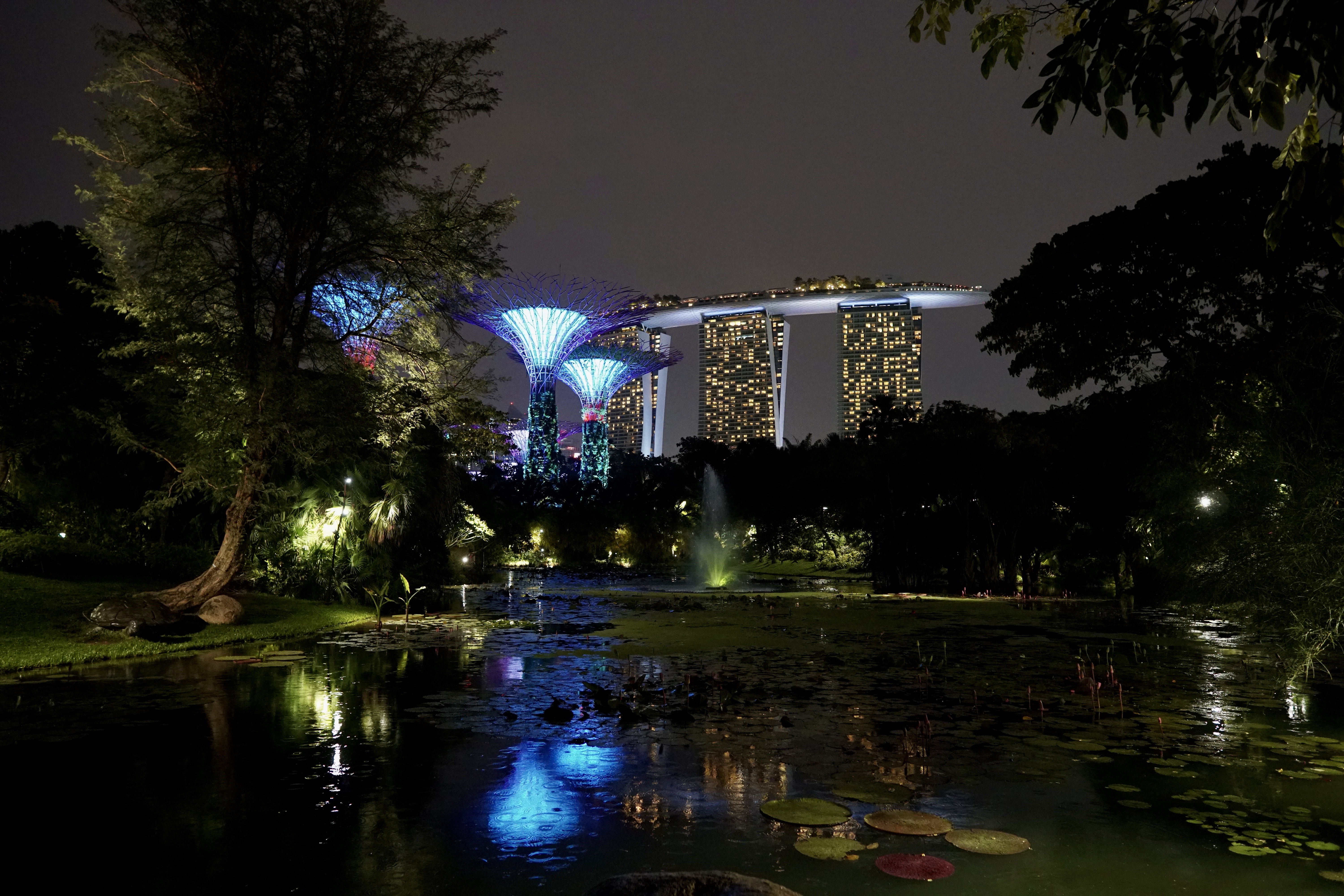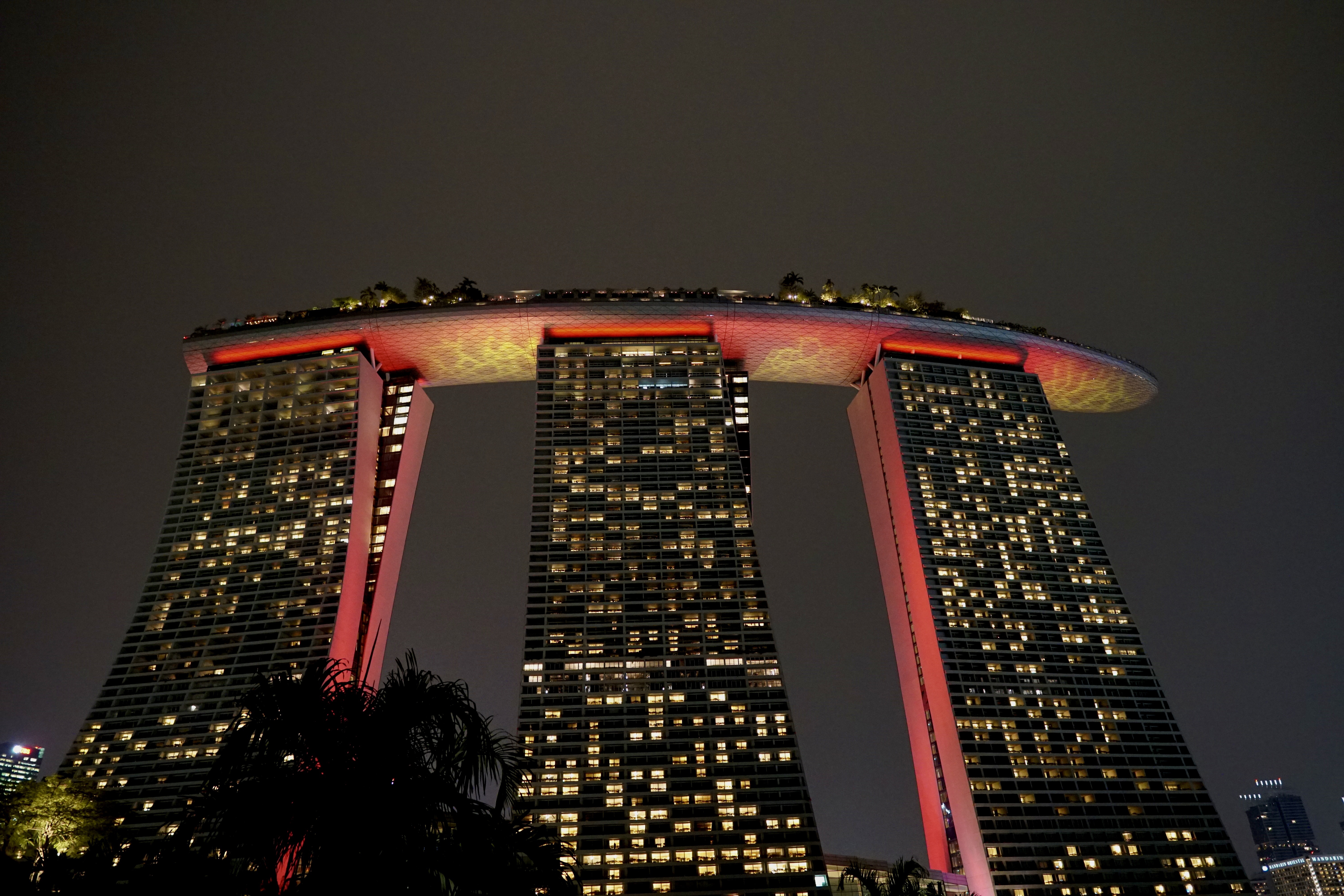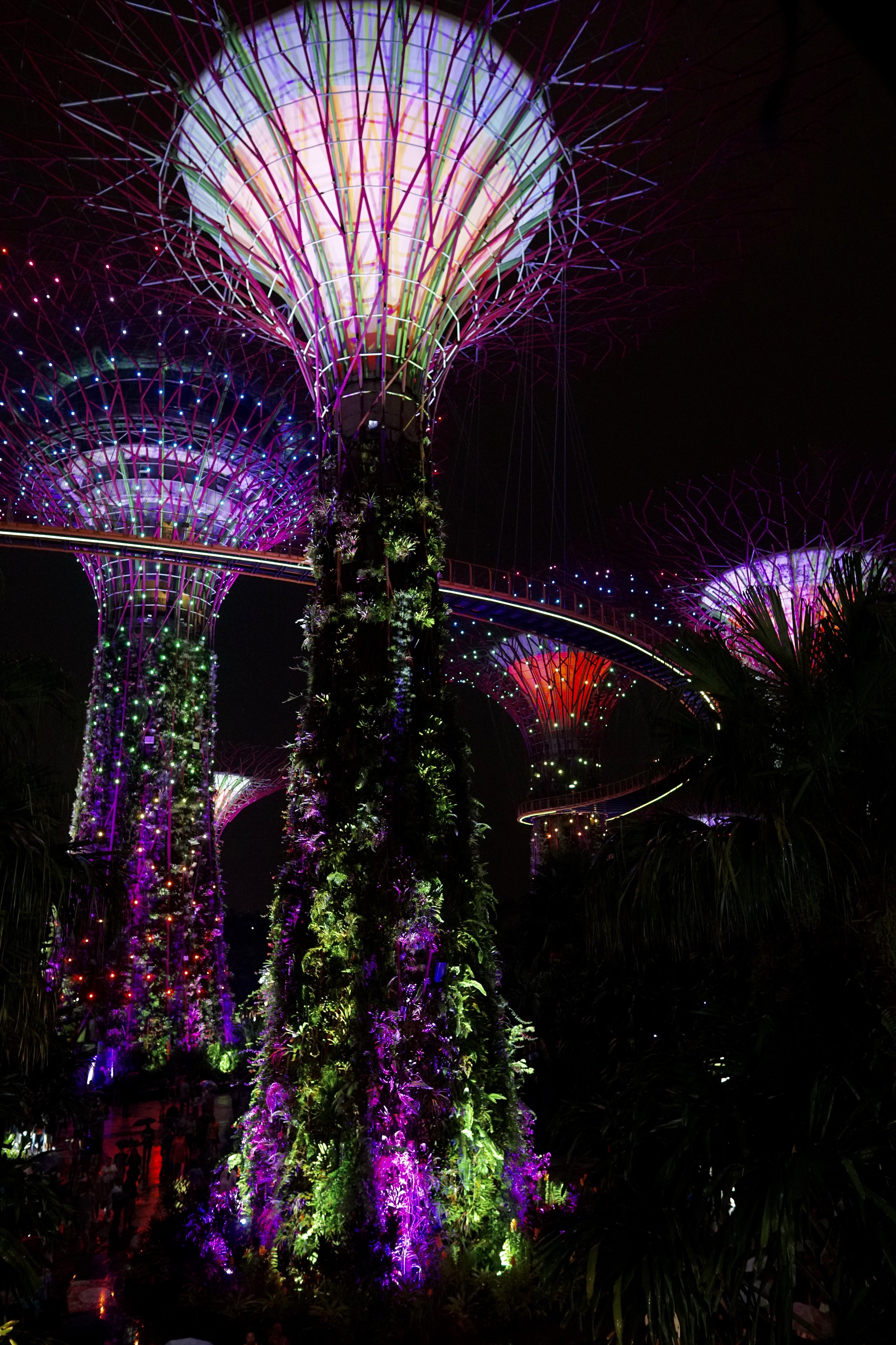 After the light show we walked back via the over bridge and the boat shaped exclusive Marina Bay Sands Hotel. Interesting to see that it is lit up with rotating different colors at night – I thought it was just the one color.