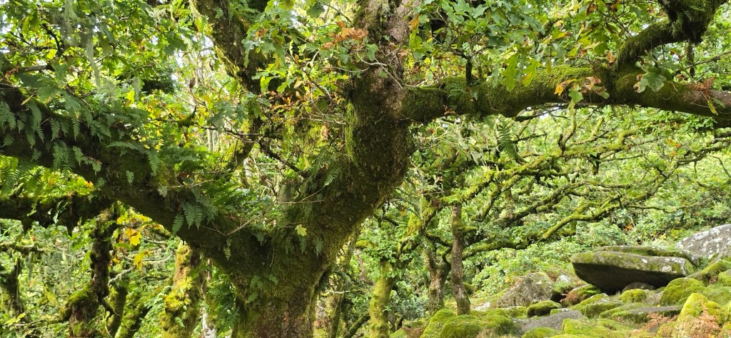 Wistman’s Wood is actually a Celtic or Atlantic rainforest – one of the few remaining and a key reason for the creation of the National Park in 1951. Twisted oaks, hazels, birch, rowan, and ash are host to a range of epiphytes. Lichens, mosses, liverworts and ferns carpet the ground level and boulders providing a wonderful air cleansing and bio diverse rich environment for all plant, bird and insect life. A boulder strewn stream flows at the bottom of the valley at the base of the wood. The forest area is quite small and the trees stunted almost like bonsai -not tall like you would imagine. Once there were vast areas of forest like this and thankfully this small part avoided clearing.