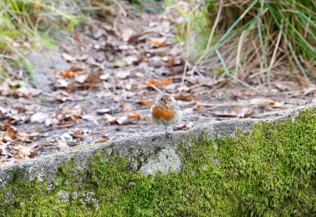 At first the forest seemed a little disappointing due to its small size and the signs that said you could only walk around the outside. This is to protect all the special mosses and fungi from human damage. We walked round for a bit and chose a place where we felt we could sit and be still. As we contemplated a little robin caught our attention and came closer. I believe birds can be a visitation of the departed; we both immediately felt that this was the place.