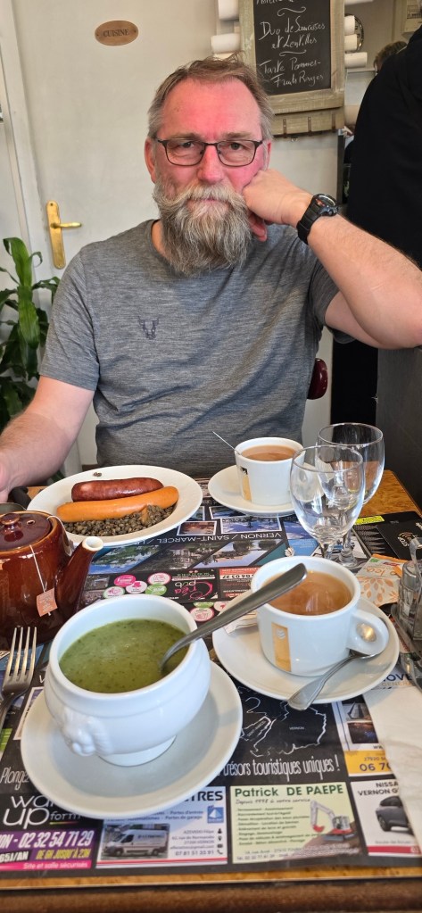 It is a good sized town, and we parked near the river and close to old town and set off on foot to find some lunch. It wasn’t long before we got to the town square and found a little cafe-restaurant that looked popular. We thoroughly enjoyed our lentil and sausage dish, and vegetable soup with a good pot of tea. On paying Vern showed his ID and got a chuckle from the proprietor who acknowledged him as a kind of gentry – Monsieur Vernon Peter.