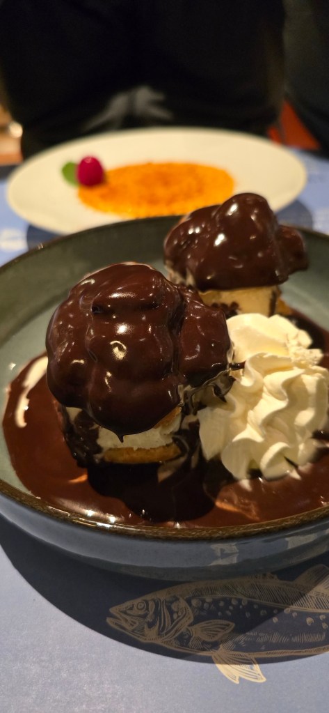 For dinner we went to a local seafood restaurant about 7 minutes drive away where I had a nice fish in lemon butter sauce dish and Vern had fish and chips. We had the 2 plate special and enjoyed a creme brûlée and the best profiteroles I have ever had, filled with creme patisserie, swimming in rich chocolate sauce, and adorned with lashings of whipped cream and some vanilla ice cream.