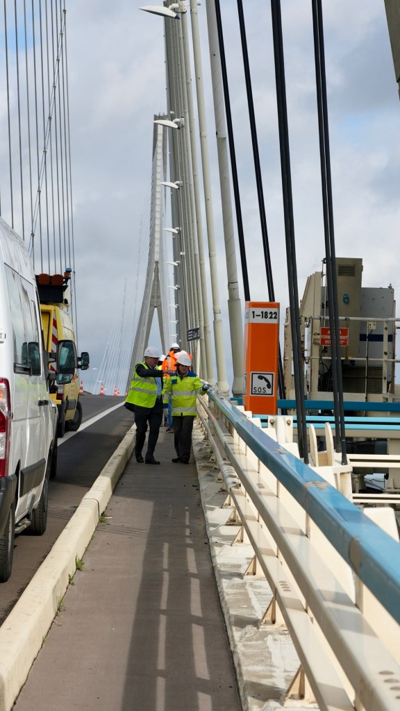 It took a bit of work finding the walking access to the impressive bridge, but find it we did. We walked 3km return to the halfway point and got a real bonus meeting the engineer who designed and over saw the building of it! When we were just on our return lap of the bridge there was part of one of the car lanes blocked off with cones and three vehicles parked. We had wondered why, and then saw some people come up from a mobile inspection platform, and Vern started a conversation with them and was introduced to the Engineer, Dr Michel Virlogeux. They had a bit of a chat, with Vern complimenting him on his work. What a buzz to meet such a man of talent, who happens to have friends in New Zealand. It made the walk extra memorable for us.