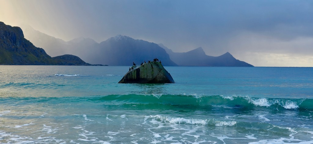Our son rung for a video chat and the sun appeared briefly so we went out late morning for a drive a bit north, on the west side of the islands to see the popular beaches Uttakleiv and Haukland. The weather of course changed again, however I managed to see the lovely water at Huakland before it packed up. The photos show the intensity of the rain coming!