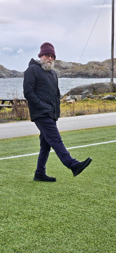We found the soccer pitch and Vern practiced his technique with an air ball. The wind was strong and chilled and woke one up quickly. It was a great idea to have this built on a rock. Picture taken, (and looking a bit like Santa Clause) we headed back home via the supermarket in Leknes for dinner supplies.