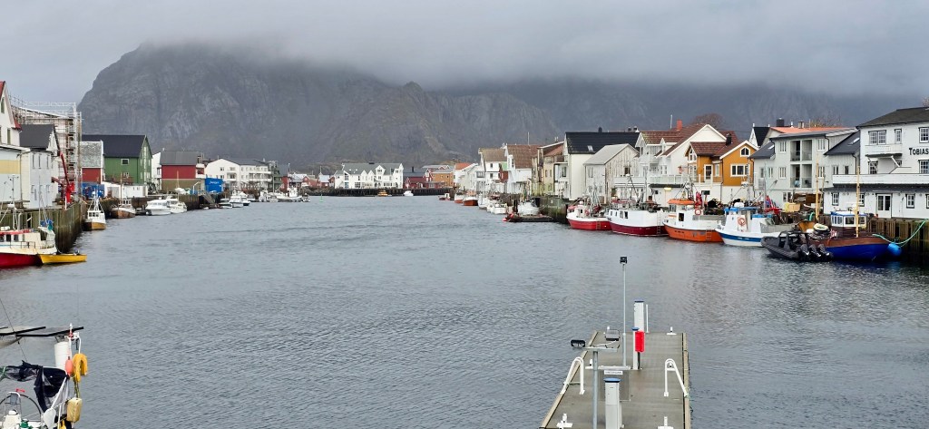 Henningsvaer is quite a cute town, known as the Venice of the north. Mmmm, a bit like the Paris of the north this requires a lot of imagination and no, I do not think it is anything like Venice. There is one little sheltered harbour, however, it is no more like Venice than Honfleur is. It has a rich history in fishing as most places in Lofoten, and a population of around 500 permanent residents. It had a bit of action going on in cafes late in the dull afternoon. This is a first we have seen in Lofoten, so it did add a bit of life and character. It is also a bit of a round village inside a rocky perimeter, accessed by a series of two bridges, which is also a bit different from the sparsely populated other villages with only one or two streets, along the side of a road,