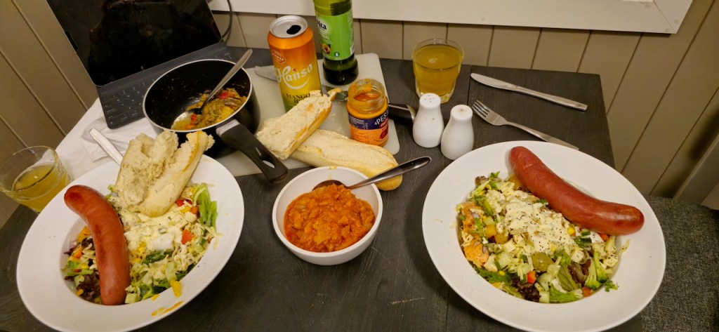 Dinner was a salad mix from a pay for weight selection, lovely big sausages cooked at home, par baked French sticks, Mango IPA and left overs. Vern particularly enjoyed the leftover reindeer stroganoff on the crunchy baguette with sun dried tomato pesto.